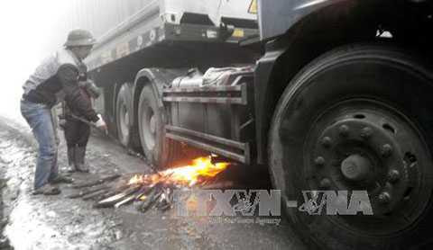 | Nhiều phương tiện đã bị chết máy do trời quá lạnh. Người tài xế này đã phải đốt lửa sấy thùng dầu để mong máy khởi động. |