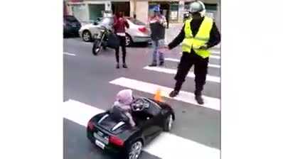 Bé gái ngơ ngác khi bị "chú" CSGT ghi vé phạt vì lỗi lái xe ôtô đồ chơi vào vạch kẻ đường dành cho người đi bộ.