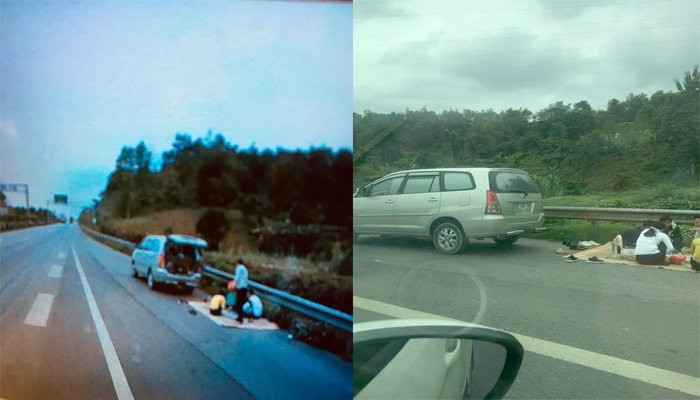 Theo anh L.Q.L - người ghi lại hình ảnh sự việc, vào trưa nay, khi đi trên cao tốc Nội Bài - Lào Cai, hướng Lào Cai đi Hà Nội, anh phát hiện một gia đình dừng xe, trải chiếu ngồi ăn uống trên đường.