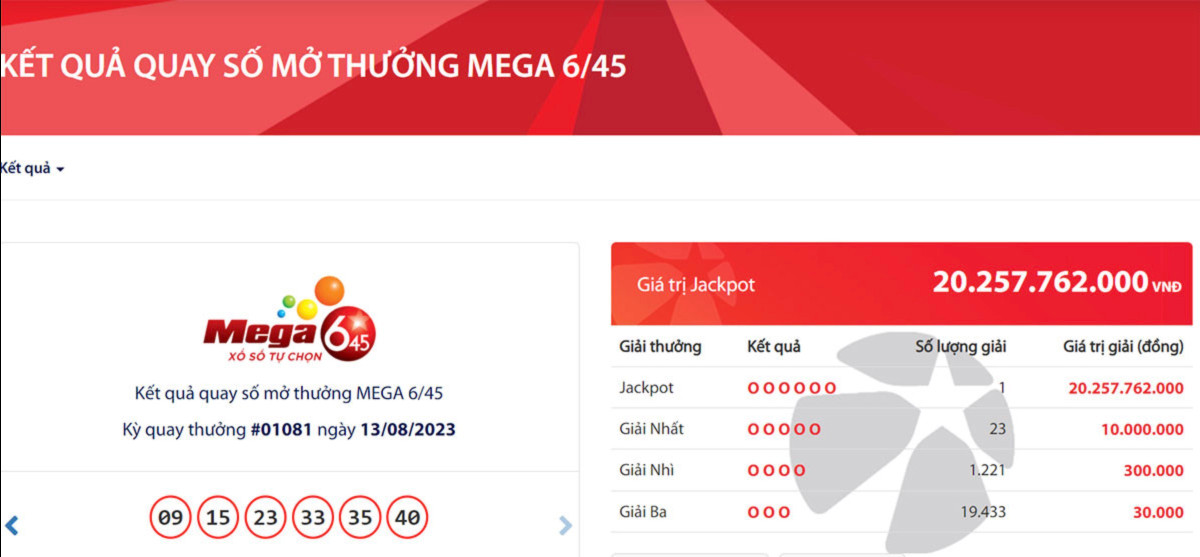 Cũng trong kỳ quay lần thứ 1081 của sản phẩm Mega 6/45, ngoài giải Jackpot trị giá hơn 20 tỷ đồng, Vieltott còn tìm ra 23 giải nhất với mỗi giải trị giá 10 triệu đồng, 1.221giải nhì mỗi giải trị giá 300.000 đồng và 19.433 giải ba với mỗi giải trị giá 30.000 đồng.