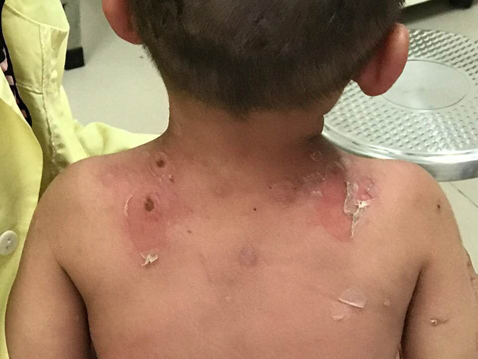 Kết quả khám lâm sàng cho thấy, trẻ bị tổn thương da, đỏ, đau rát, có bọng nước lan tỏa toàn thân; xuất hiện bong trợt da nhiều ở vùng, nhiều dịch mủ chảy ra.