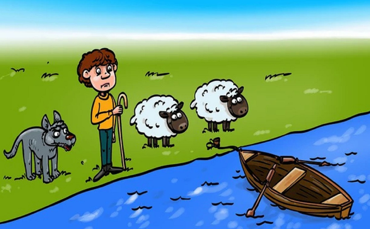 Người đàn ông cùng 2 con cừu và một con sói đang muốn qua sông. Cạnh bờ sông có một con thuyền nhưng chỉ đủ để chở mỗi lần 1 con vật. Lưu ý rằng nếu người đàn ông để cừu một mình cùng với sói thì sói sẽ ăn thịt cừu. Bạn hãy tìm cách giúp người đàn ông này đưa cả 3 con vật qua sông nhé!