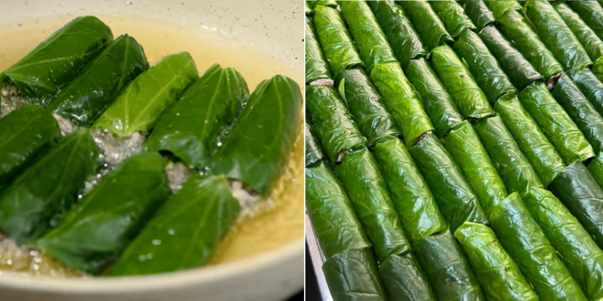 Quay mặt nào của lá ra ngoài cũng được, tùy thuộc vào yêu cầu của bạn với món ăn. Nếu muốn thành phẩm đẹp mắt hơn, bạn nên để úp phần mặt lá màu xanh ra ngoài. Có một điều bạn cần nhớ, khi cuộn nên bắt đầu từ phần cứng rồi đến phần đuôi lá mềm để cuốn đè lên.