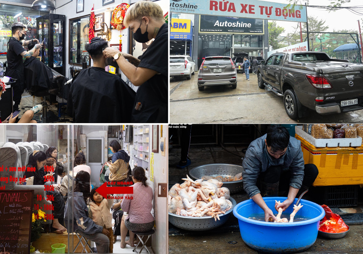 Anh Nguyễn Thiện, chủ một cửa hàng cắt tóc trên đường Lương Định Của (quận Đống Đa, Hà Nội) cho biết: "Những ngày thường, cửa hàng của tôi hoạt động từ 9h đến 19h nhưng những ngày giáp Tết, tôi phải tăng thời gian lên, từ 7h đến 12h đêm, riêng ngày giao thừa thì đóng cửa sớm hơn chút, khoảng 22h. Do lượng khách quá đông nên tôi chỉ dám nhận lịch của những khách đã đặt trước và không dám nhận thêm".