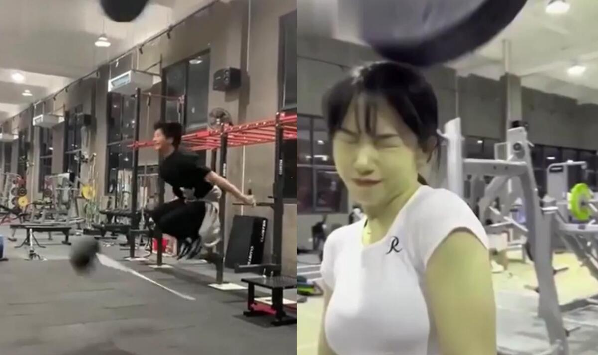 Pha "làm màu" quá mức của thanh niên trong phòng gym bị lộ tẩy khi chiếc tạ văng vào đầu mà người đẹp chẳng hề hấn gì.