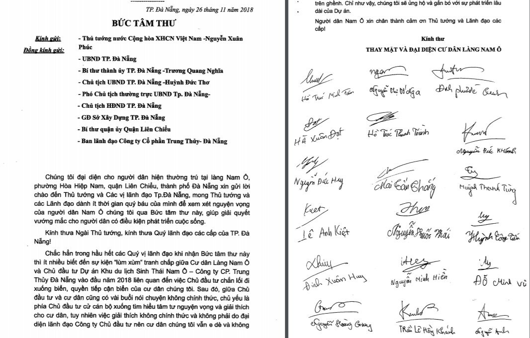 Trước đó, bức “tâm thư” được Tập đoàn Trung Thủy gửi PV VTC News và đề nghị "hỗ trợ thông tin khách quan", dài 4 trang, có 18 chữ ký được cho là của người dân Nam Ô, phường Hòa Hiệp Nam, quận Liên Chiểu.