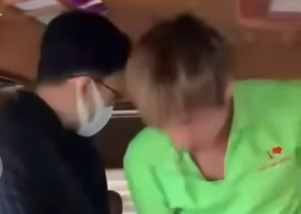 Nhân viên nhà xe Hải Vân (áo xanh) rời đi sau khi đánh đập hành khách. (Ảnh cắt từ clip)