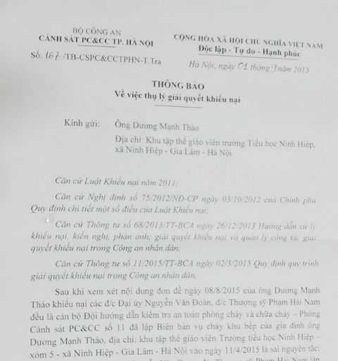 Theo thông báo này, Sở Cảnh sát PC&CC TP Hà Nội đã xem xét nội dung đơn đề ngày 8/8/2015 của ông Dương Mạnh Thảo.