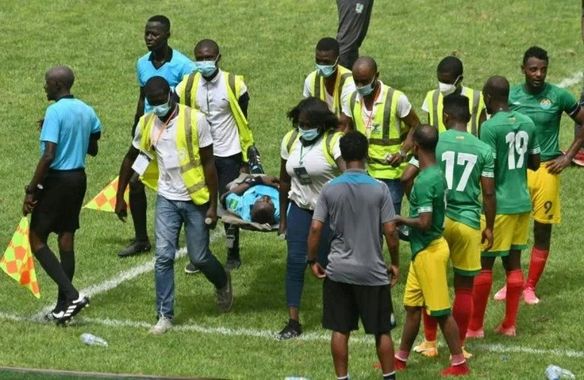 Trọng tài rời sân trên cáng khiến trận đấu Bờ Biển Ngà và Ethiopia kết thúc sớm 10 phút. (Ảnh: AFP).