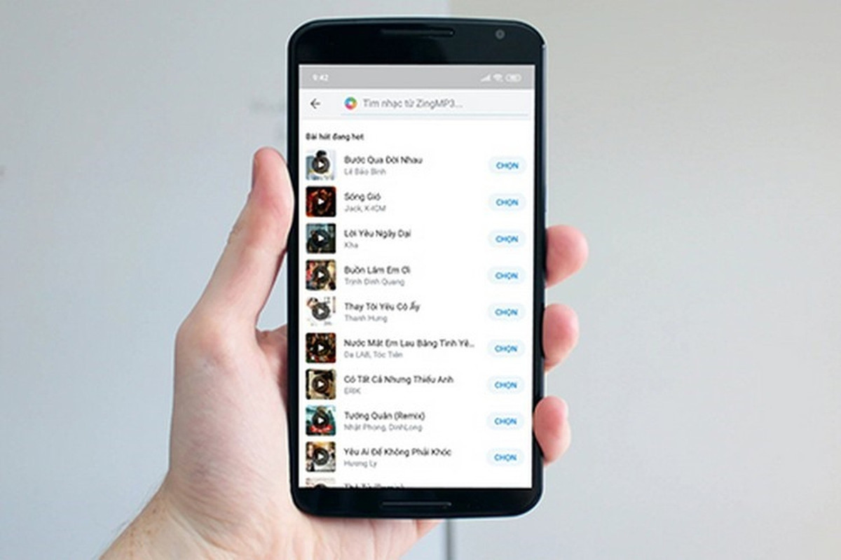 Bước 2: Toàn bộ các bài hát được liên kết với ZingMP3 sẽ được hiển thị. Lúc này bạn có thể tìm kiếm bài hát theo ý mình, nghe thử rồi ấn vào nút Chọn để sử dụng bài.