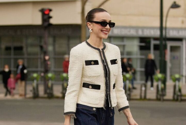 Áo khoác tweed với các sợi vải đan xen phức tạp sẽ trông sang trọng hơn vải trơn.