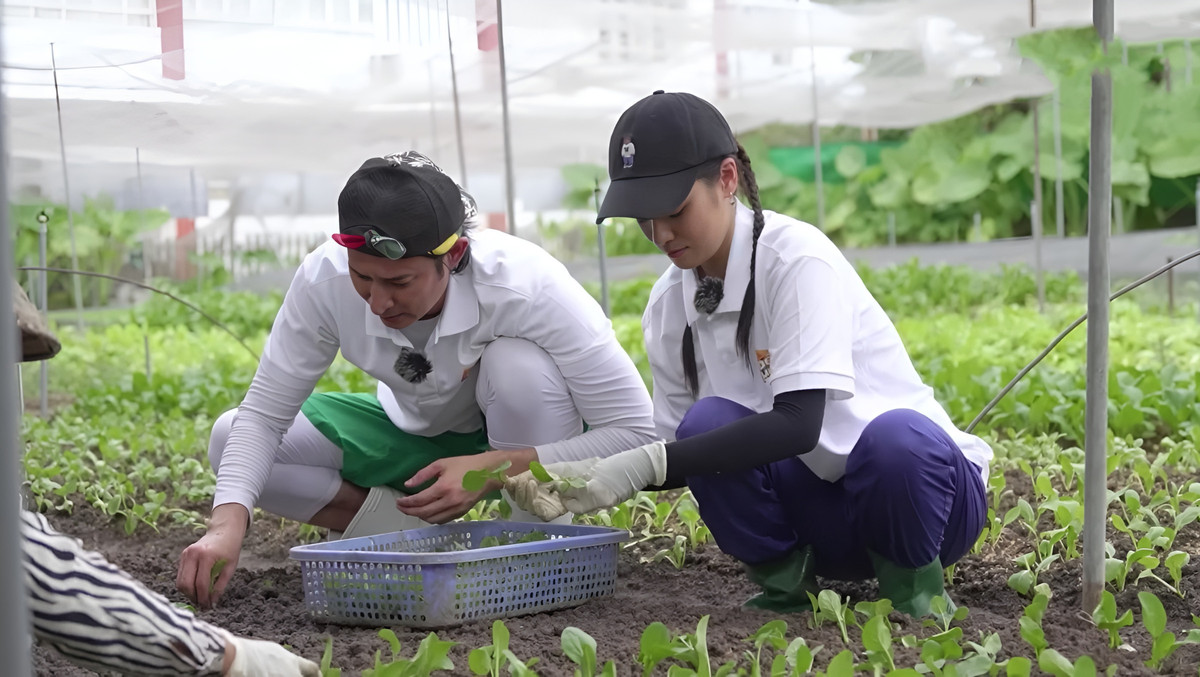 Huy Khánh và Hoàng Yến Chibi đi hái rau.