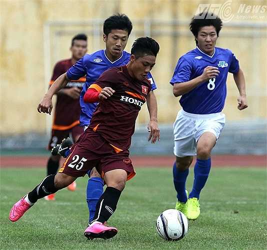 Lối chơi máu lửa của tiền đạo xứ Nghệ giúp khả năng tranh chấp với các cầu thủ to cao JFL Selection được cải thiện đáng kể