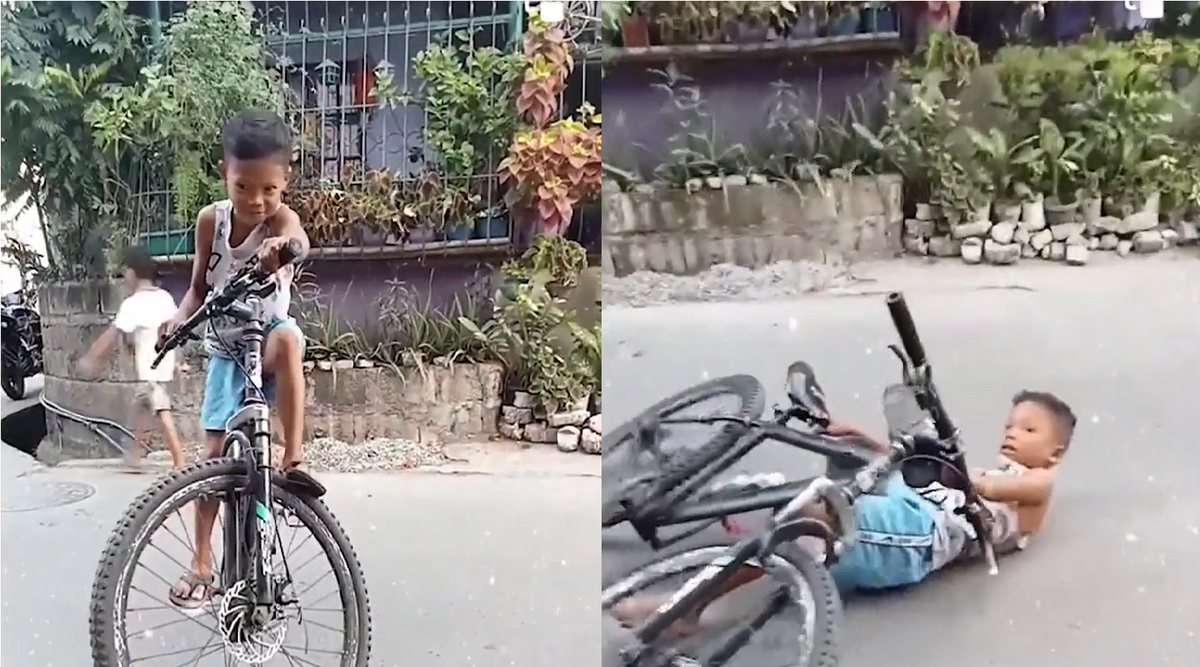 Cậu bé thành thục giữ thăng bằng xe đạp nhưng khi gần hoàn thành thì xe bất ngờ nghiêng ngả khiến cậu bé ngã nhào xuống đất.