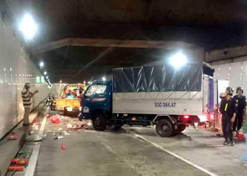 Đang lưu thông trong hầm Thủ Thiêm thì bất ngờ chiếc xe tải tông vào các công nhân đang làm vệ sinh tại làn đường ô tô khiến 5 người thương vong.