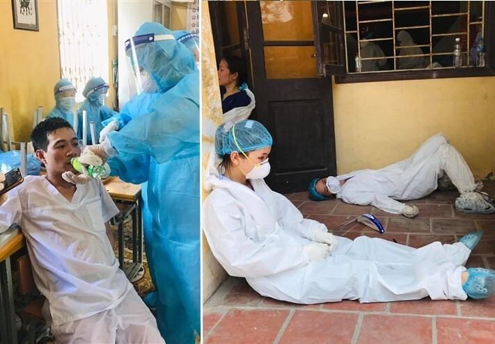 Bác sĩ Nguyễn Hồng Hải (công tác tại Trung tâm Y tế huyện Quế Võ) bị ngất xỉu, được đồng đội sơ cứu, hỗ trợ. Giữa trời nắng nóng gần 40 độ C, anh và các đồng nghiệp phải mặc đồ bảo hộ cấp độ 4 lấy mẫu xét nghiệm liên tục trong nhiều giờ.