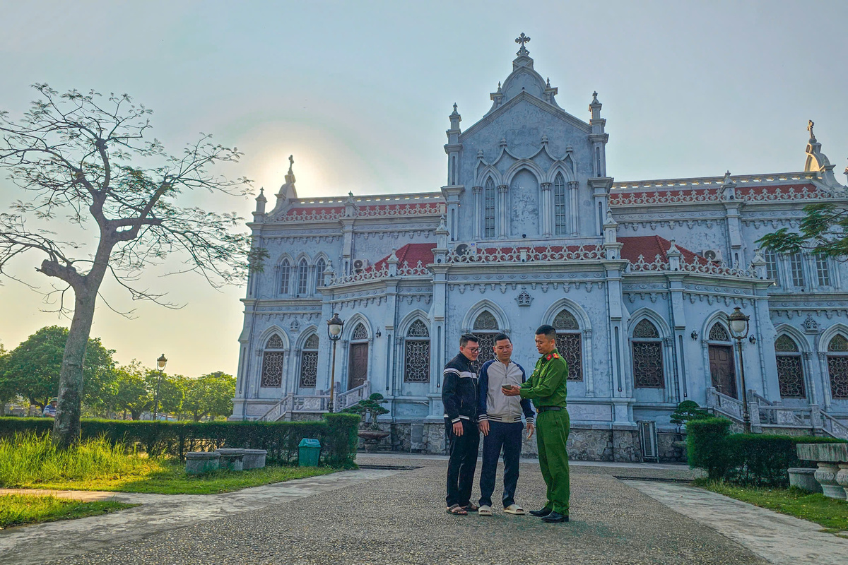 Công an xã Nghĩa Sơn gặp gỡ, tuyên truyền tới giáo dân tại khu vực nhà thờ về việc tham gia bầu cử, thực hiện quyền và nghĩa vụ công dân. (Ảnh: Minh Quang)