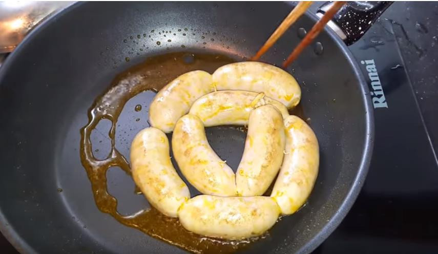 - Xúc xích sau khi hấp chín thì cắt hết phần dây buộc, để nguội rồi đem chiên hoặc nướng.