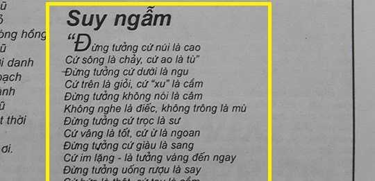 Phần đầu là bài "Suy Ngẫm" của Khánh Nguyên, phần tiếp có 20 câu trong bài "Đừng tưởng" của tôi, phần ít còn lại là những câu khác; trong đó có những câu không vần nhau theo đúng thể lục bát, có cả câu trùng lặp với câu ở phần trước, (Ví dụ: Đừng tưởng nốc rượu là say - Đừng tưởng cứ rượu là say), rất vô nghĩa và lộn xộn, thể hiện rõ sự chắp vá, không phải là phong cách thơ của một người làm ra.