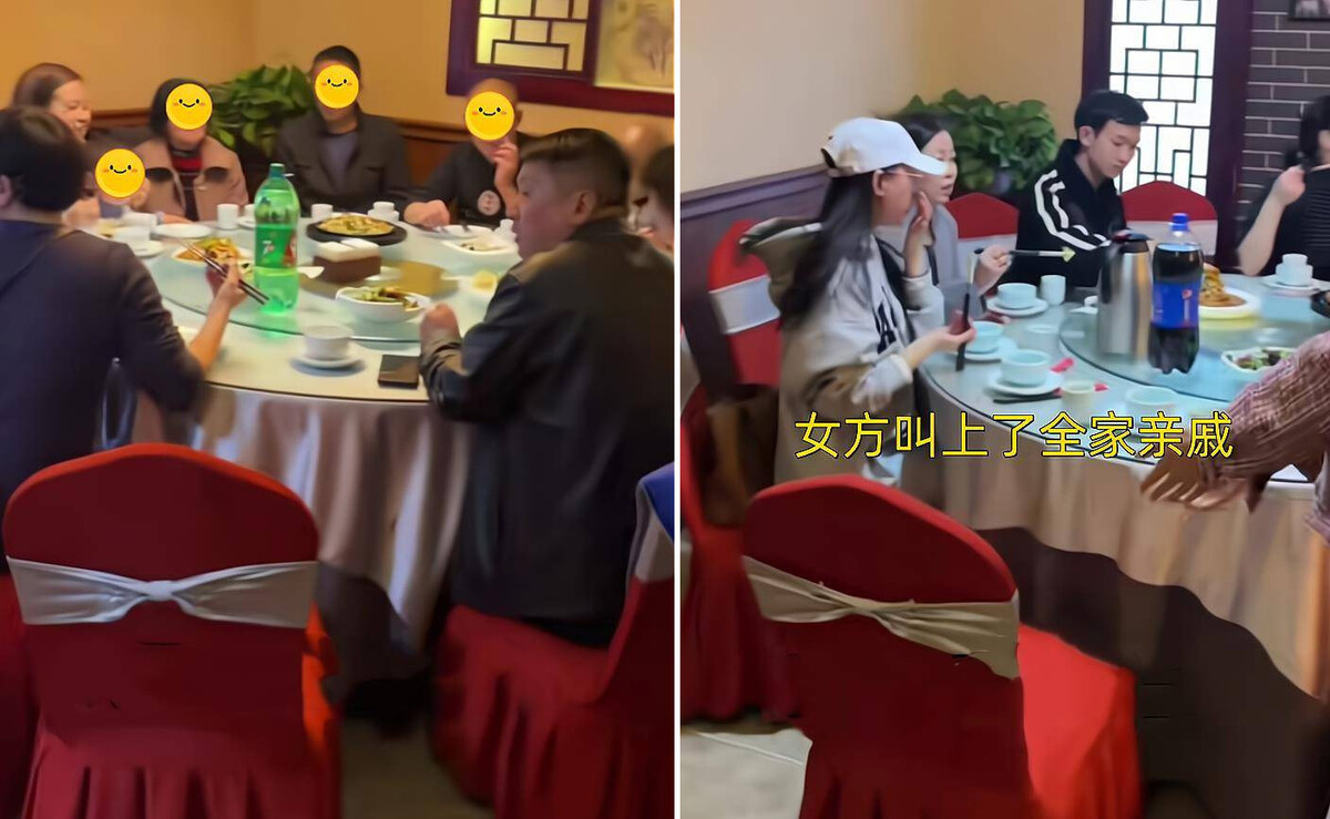 Anh Lượng, một nam thanh niên ở Chiết Giang được giới thiệu làm quen với một cô gái trẻ. Anh Lượng đã hẹn cô gái đi ăn trong buổi hẹn hò đầu tiên. Tuy nhiên khi tới nhà hàng, chàng trai đã ngã ngửa khi thấy cảnh tượng trong nhà hàng lúc đó. Bởi không chỉ có cô gái tới buổi hẹn mà rất đông người nhà cô cùng có mặt tại nhà hàng lúc này.