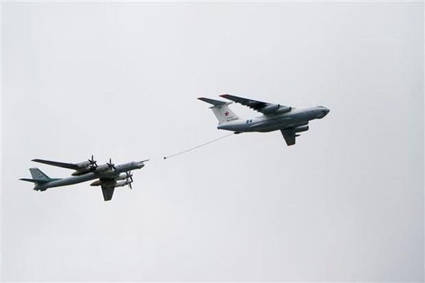 Máy bay vận tải tiếp nhiên liệu trên không IL-78 và máy bay ném bom chiến lược Tu-95MS của không quân Nga. (Ảnh: Trần Hiếu/TTXVN)