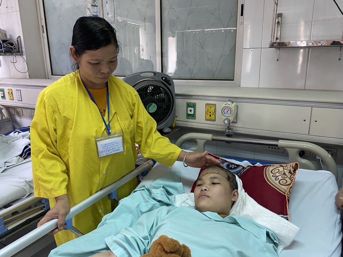 Ở viện chăm sóc con gái, chị Đặng Thị Hồng - mẹ của Huyên chẳng thể cầm nước mắt mỗi lần nhìn con. Đưa tay khẽ sờ vết sẹo dài trên mặt con chị không biết tương lai sẽ ra sao.