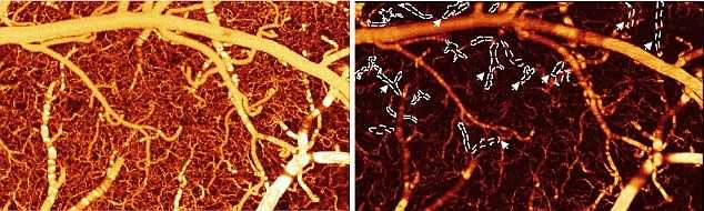 | Trong ảnh bên trái, người xem thấy các mạch máu của chuột khi cocaine chưa xâm nhập cơ thể chúng. Nhưng trong ảnh bên phải, những mạch máu trở nên thẫm hơn sau khi cocaine xâm nhập cơ thể chuột. Mức độ thẫm càng lớn thì máu di chuyển càng chậm. Ảnh: Daily Mail |