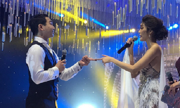 Bất ngờ hơn, người đẹp cùng chồng trình diễn một tiết mục đặc biệt trước mặt khách mời. Từ giai điệu nhẹ nhàng, cả hai chuyển sang nền nhạc sôi động khuấy động không khí. Khách mời có mặt liên tục hò reo cổ vũ cho cặp đôi.