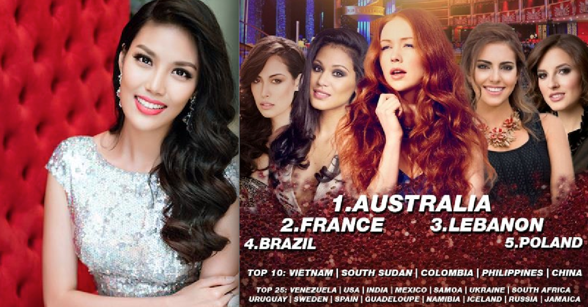 Chuyên trang sắc đẹp Globalbeauties vừa đưa ra bảng xếp hạng cuối cùng, trong đó Lan Khuê được dự đoán sẽ không có mặt trong Top 5 Hoa hậu Thế giới 2015.