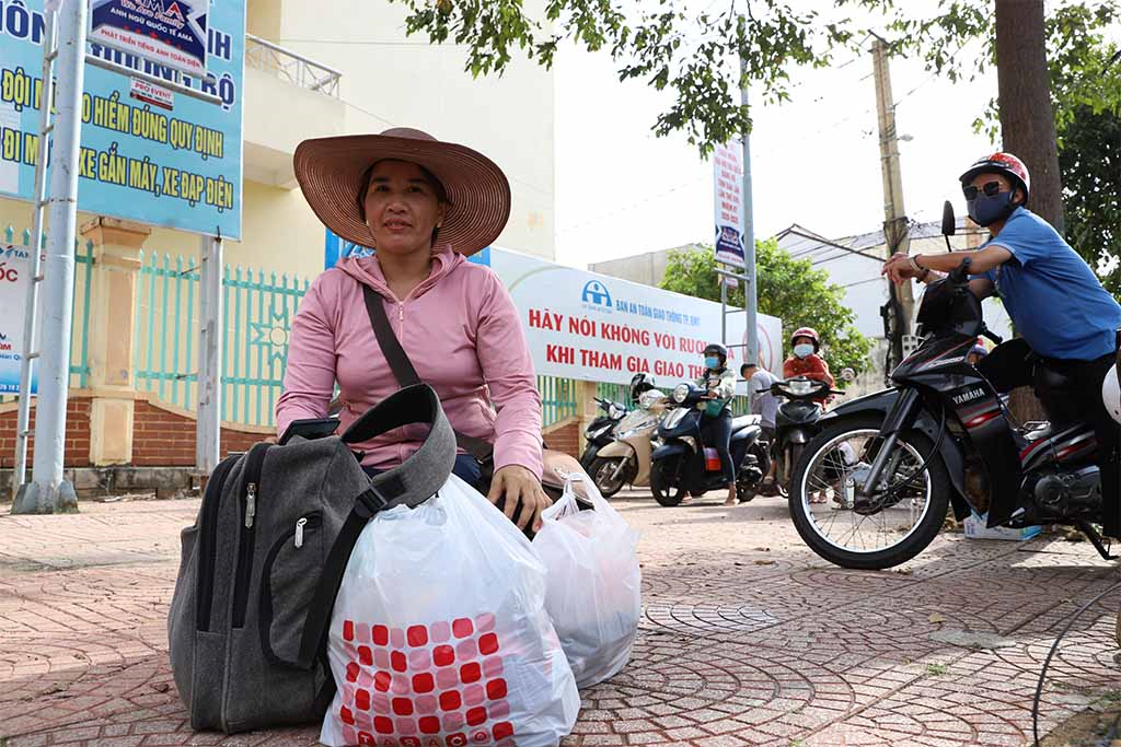 Tay xách nách mang với nhiều túi đồ, chị Phạm Thị Hóa (trú huyện Đắk R’Lấp, tỉnh Đắk Nông) chia sẻ: “Hôm nay con tôi thi buổi cuối cùng nên tôi mang đồ ra đây, đợi cháu thi xong thì hai mẹ con đón xe về lại Đắk Nông. Cháu học ở Trường Phổ thông Dân tộc nội trú Tây Nguyên”.