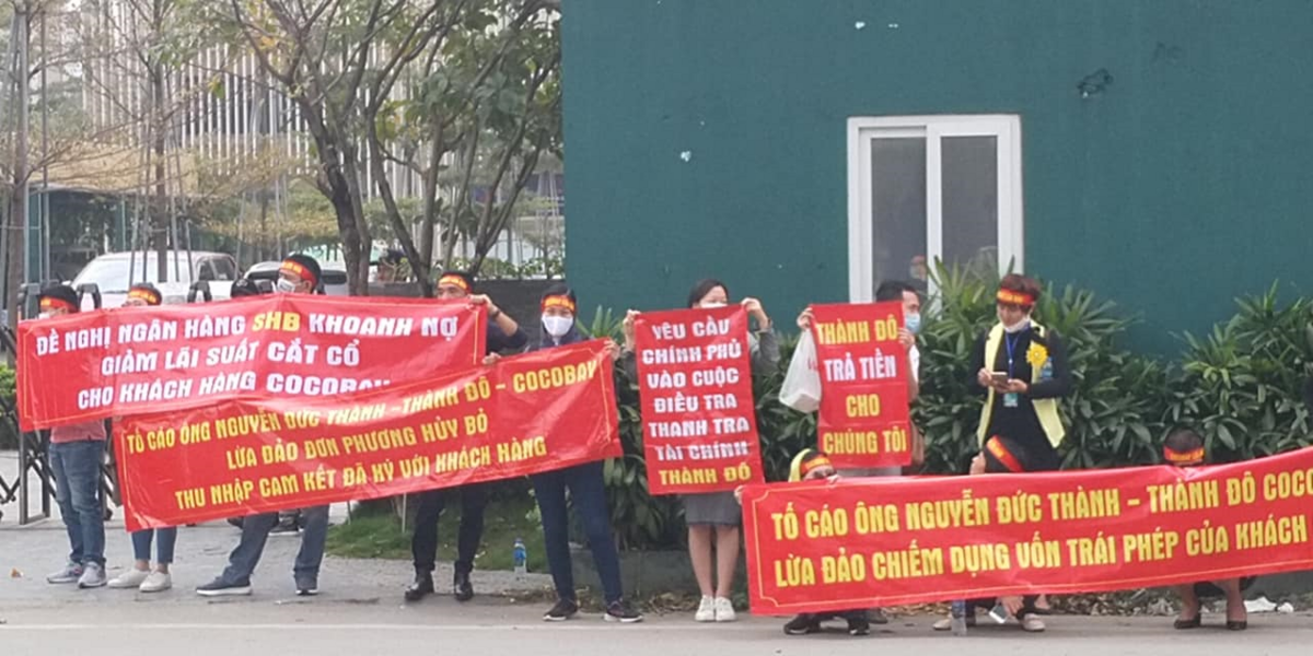 Nhiều khách hàng bức xúc căng băng rôn phản đối chủ đầu tư Cocobay Đà Nẵng.