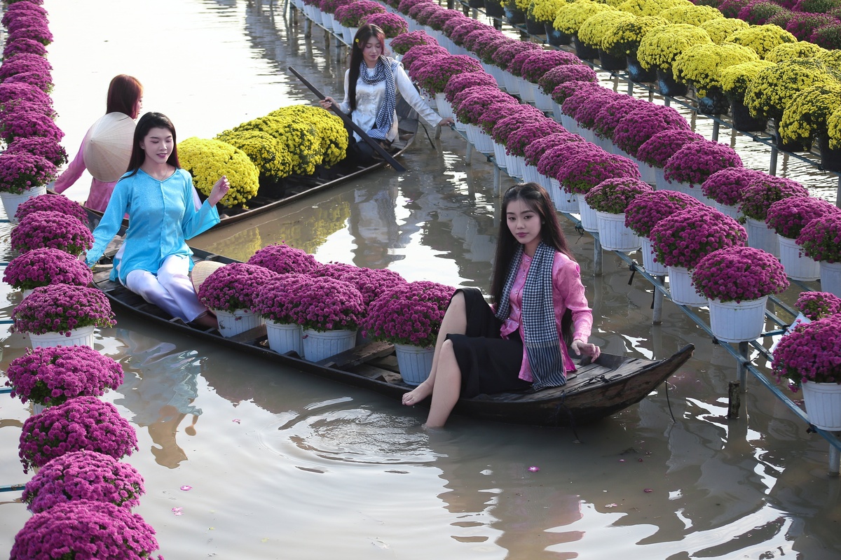 Nhiều du khách, đặc biệt là các bạn trẻ, lựa chọn diện áo bà ba kết hợp khăn rằn - trang phục đặc trưng Nam Bộ để check-in, lưu giữ những khoảnh giữa không gian ngập tràn sắc hoa.