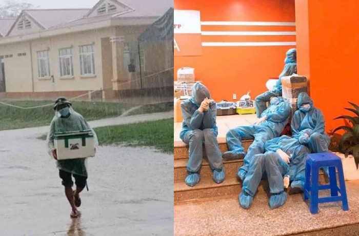 "Hình ảnh anh bộ đội đưa cơm giữa trời mưa tầm tã trong khu nhà ở cách ly làm lay động hàng triệu con tim người Việt". (Ảnh: Quốc Việt)