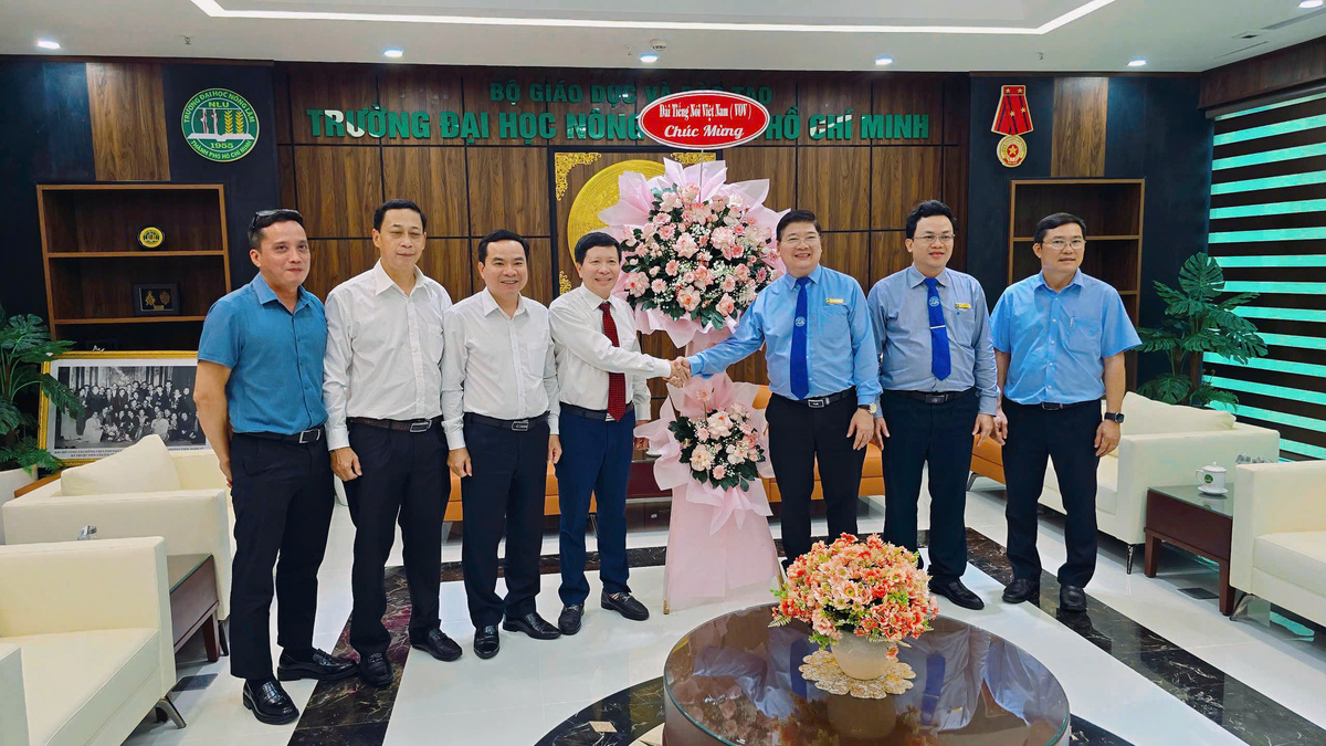 Ông Vũ Hải Quang - Phó Tổng Giám đốc Đài Tiếng nói Việt Nam (thứ năm từ trái sang) trao lẵng hoa chúc mừng trường Đại học Nông Lâm TP.HCM nhân dịp Kỷ niệm 70 năm thành lập trường và 43 năm Ngày Nhà giáo Việt Nam (20/11/1982 - 20/11/2025).