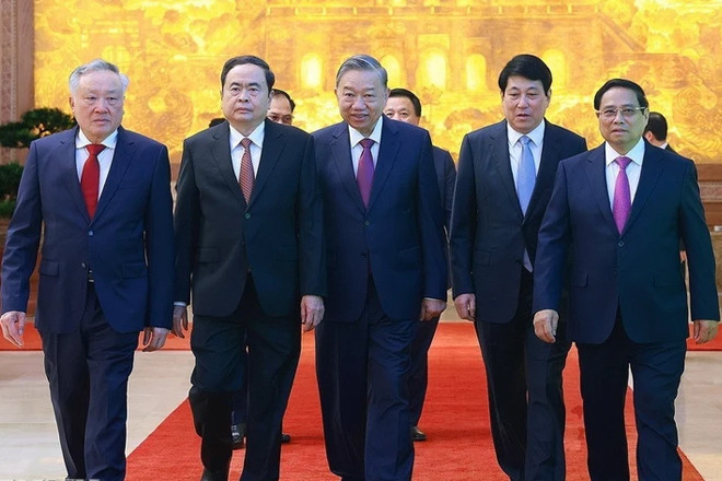 Tổng Bí thư Tô Lâm, Chủ tịch nước Lương Cường, Thủ tướng Phạm Minh Chính, Chủ tịch Quốc hội Trần Thanh Mẫn và Phó Thủ tướng Thường trực Nguyễn Hòa Bình tới dự Hội nghị trực tuyến Chính phủ với các địa phương. (Ảnh: VGP)