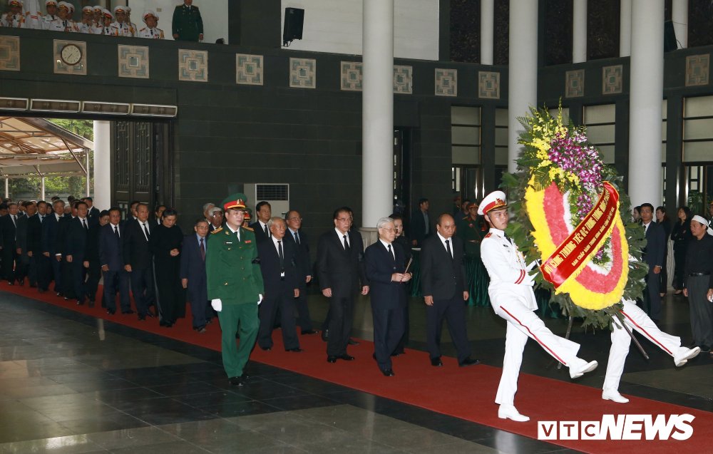 Tổng Bí thư, Chủ tịch nước Nguyễn Phú Trọng dẫn đầu Đoàn Ban Bí thư Trung ương Đảng vào viếng. Trong đoàn có Thủ tướng Nguyễn Xuân Phúc, Chủ tịch Quốc hội Nguyễn Thị Kim Ngân cùng nhiều vị lãnh đạo, nguyên lãnh đạo Đảng, Nhà nước.
