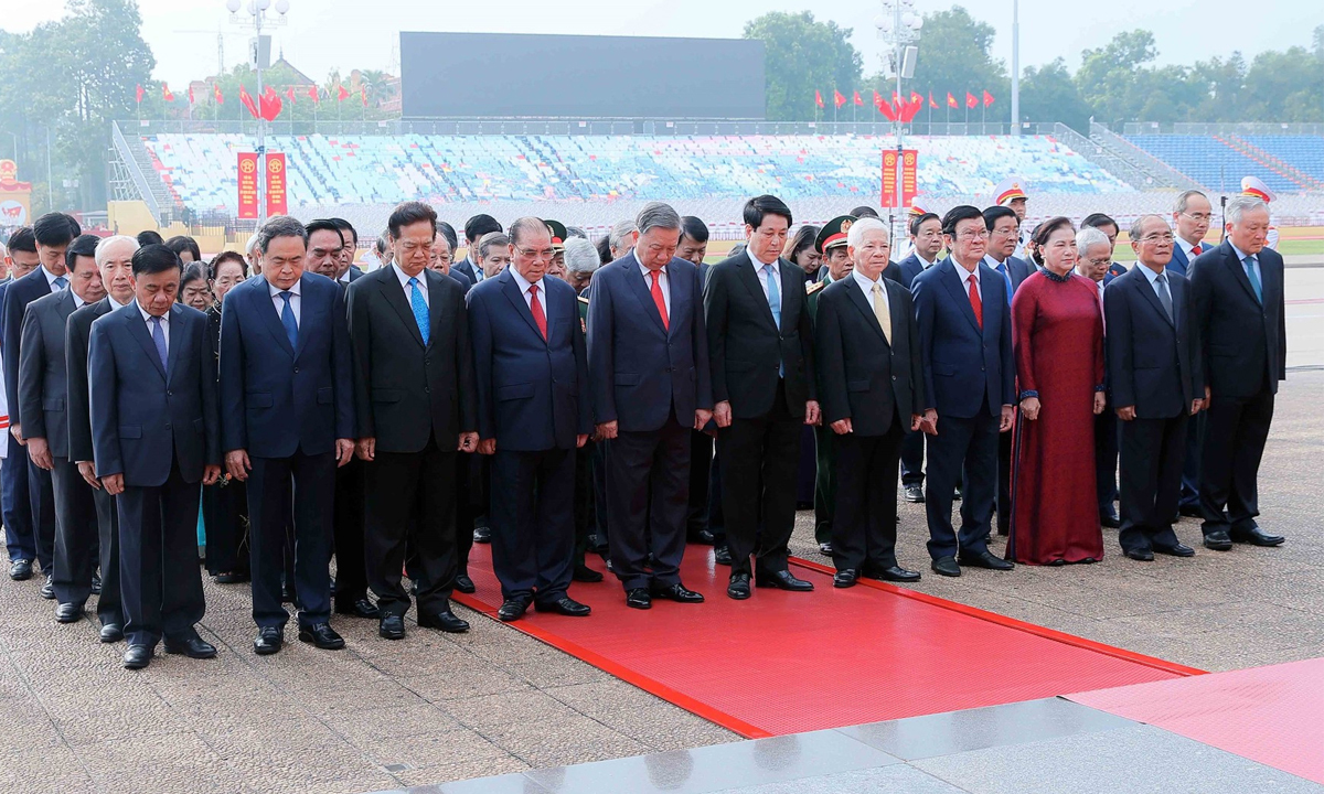 Với lòng biết ơn vô hạn, lãnh đạo Đảng, Nhà nước đã thành kính tưởng nhớ Chủ tịch Hồ Chí Minh, vị lãnh tụ thiên tài, Anh hùng giải phóng dân tộc. Người đã cống hiến cả cuộc đời cho dân, cho nước, dẫn dắt Đảng ta, Nhân dân ta làm nên những thắng lợi vẻ vang, làm rạng rỡ dân tộc ta, non sông đất nước ta. Tư tưởng và sự nghiệp của Người là tài sản vô giá, ngọn đuốc soi đường cho dân tộc ta vững bước đi tới tương lai.