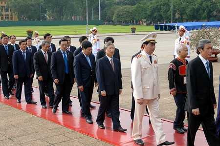 Tổng Bí thư Nguyễn Phú Trọng, nguyên Tổng Bí thư Nông Đức Mạnh; Chủ tịch nước Trương Tấn Sang, nguyên Chủ tịch nước Trần Đức Lương; Thủ tướng Chính phủ Nguyễn Tấn Dũng; Chủ tịch Quốc hội Nguyễn Sinh Hùng, nguyên Chủ tịch Quốc hội Nguyễn Văn An; các đồng chí Uỷ viên Bộ Chính trị, Bí thư Trung ương Đảng, các đồng chí nguyên Uỷ viên Bộ Chính trị, nguyên Bí thư Trung ương Đảng… đã đặt vòng hoa, vào Lăng viếng Bác.