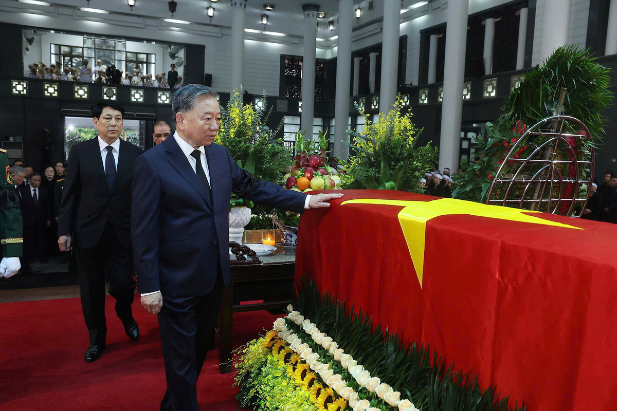 Tổng Bí thư Tô Lâm đặt tay lên linh cữu phủ Quốc kỳ, tiễn biệt nguyên Chủ tịch nước Trần Đức Lương. (Ảnh: TTXVN)