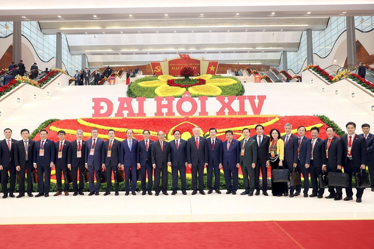 Ủy viên Bộ Chính trị, Thủ tướng Chính phủ Phạm Minh Chính và các đại biểu dự phiên khai mạc Đại hội chụp ảnh lưu niệm. (Ảnh: TTXVN)