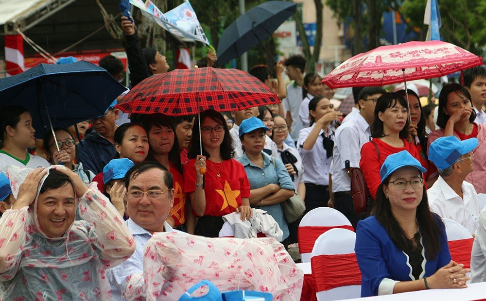 Tại điểm cầu này, ông Đào Anh Dũng - Phó chủ tịch thường trực UBND TP Cần Thơ, bà Võ Thị Hồng Ánh - Phó chủ tịch UBND TP Cần Thơ, Trưởng ban Tuyên giáo cùng lãnh đạo sở, ngành và hơn 3.000 học sinh, giáo viên, phụ huynh đội mưa cổ vũ cho Vinh.