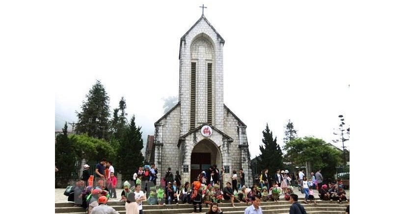 Khách du lịch tại nhà thờ cổ ở trung tâm thị trấn Sa Pa. (Ảnh: Quốc Khánh/TTXVN)