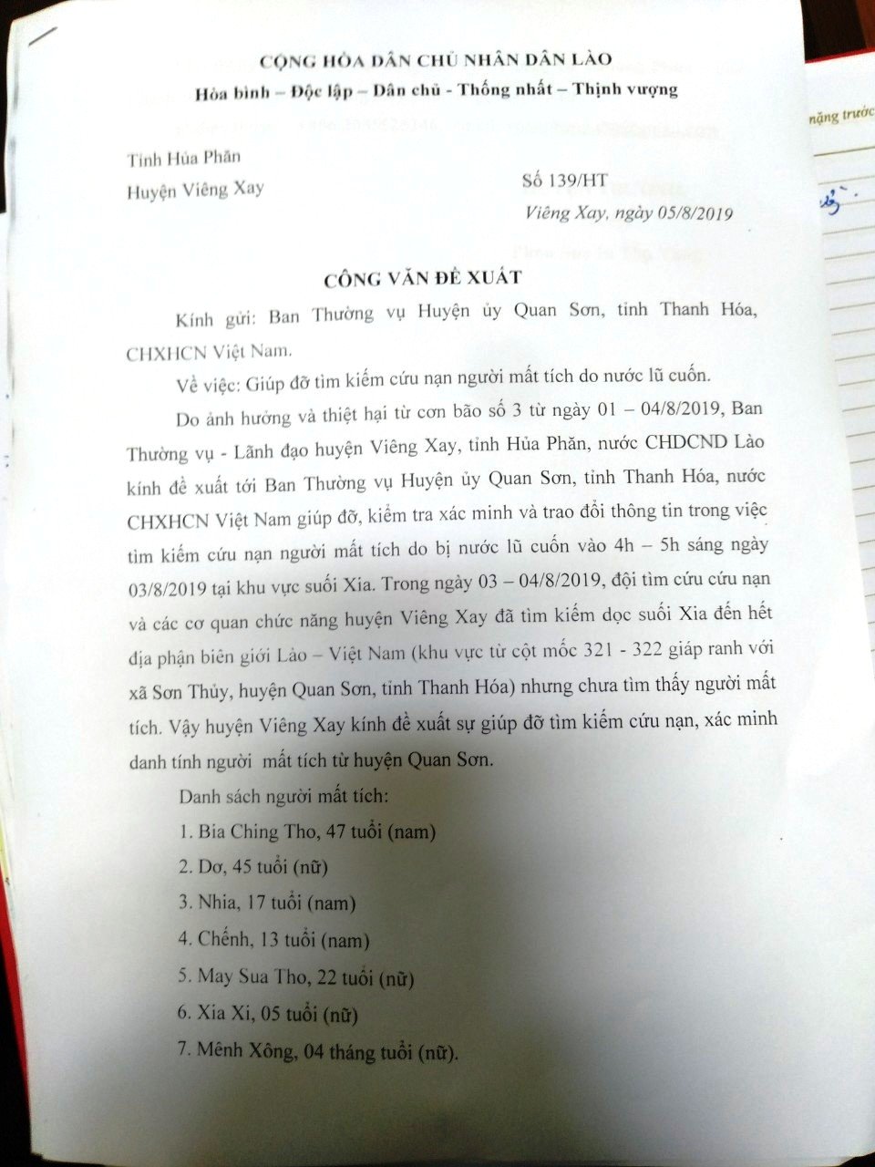 Chiều 5/8, UBND huyện Quan Sơn (Thanh Hóa) thông tin, đơn vị nhận được công văn của huyện Viêng Xay, tỉnh Hủa Phăn (Lào) về việc đề nghị giúp đỡ tìm kiếm, cứu nạn người nước bạn bị mất tích do nước lũ cuốn.