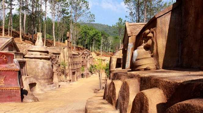 Tuy làm chất liệu hoàn toàn bằng đất nhưng dưới bày tay khéo léo của những người thợ tài hoa, đường hầm trở thành một công trình điêu khắc mềm mại và vô cùng sống động, từ khu rừng nguyên sinh với cây cối cổ thụ, suối nước róc rách, đàn voi, muông thú quanh những mái nhà sàn.