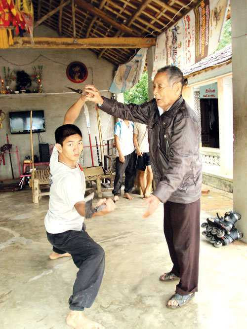 | Lão võ sư Phan Thọ đang truyền nghề cho cháu nội |