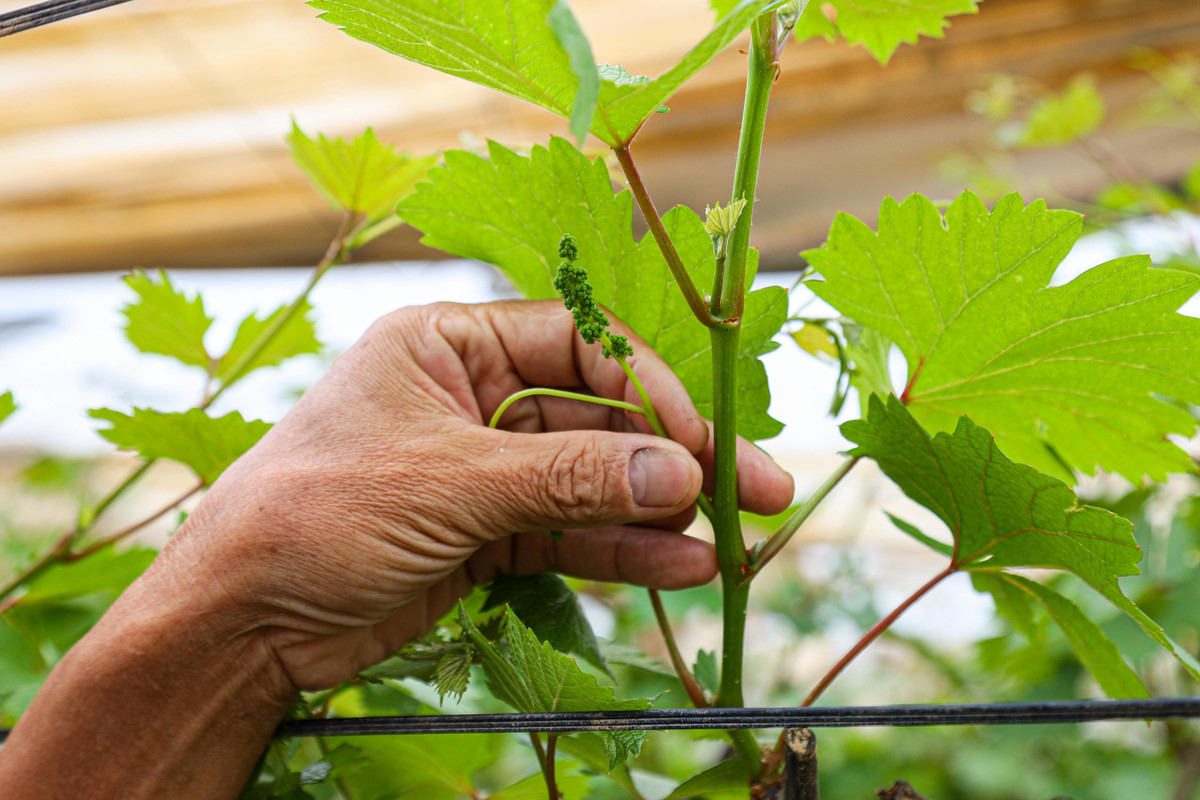 Những bông hoa nho trái mùa đáng lẽ sẽ được cắt bỏ nhưng nay lại được ông Thiết giữ lại để theo dõi và chăm sóc. Nếu trồng lại cây mới thì sẽ lại mất 2,3 năm mới có thể thu hoạch lại được.