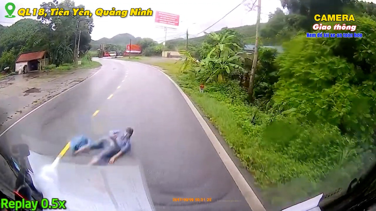 Nam thanh niên tại huyện Tiên Yên, Quảng Ninh chạy xe máy tốc độ cao, khi vào cua đã trượt ngã trước đầu xe tải, may mắn người này chỉ bị gãy tay.