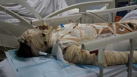 "Bệnh nhân nhập viện trong tình trạng hôn mê sâu, huyết áp tụt 90/60mm thủy ngân. Ở mặt, cổ, lưng, người, tay, chân bỏng rất nặng, nhiều điểm bỏng sâu ở độ 3, 4. Các bác sĩ đã tiến hành cấp cứu, cho thở máy và dùng các thuốc giảm đau, an thần, kháng sinh, bù dịch điện giải để điều trị các vết bỏng.