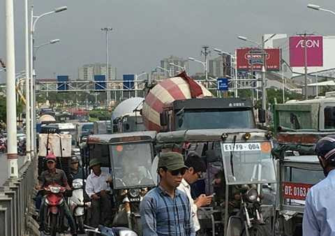 | Đường dẫn lên cầu Vĩnh Tuy ùn tắc do vụ tai nạn |