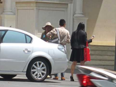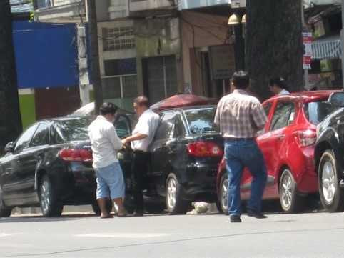 | Một người đàn ông vừa bước ra khỏi xe thì bị người phụ nữ chặn lại đòi thu tiền đậu xe. |